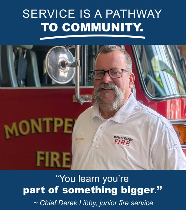 Libby volunteered for 14 years at Stowe Fire and Rescue, with many of those years also as a volunteer on Stowe Mountain Rescue. His service led to 25 years as a career fire fighter and Advanced EMT in Burlington. He became Montpelier’s fire chief in 2024. Libby built his career in firefighting and watched his son do the same.
